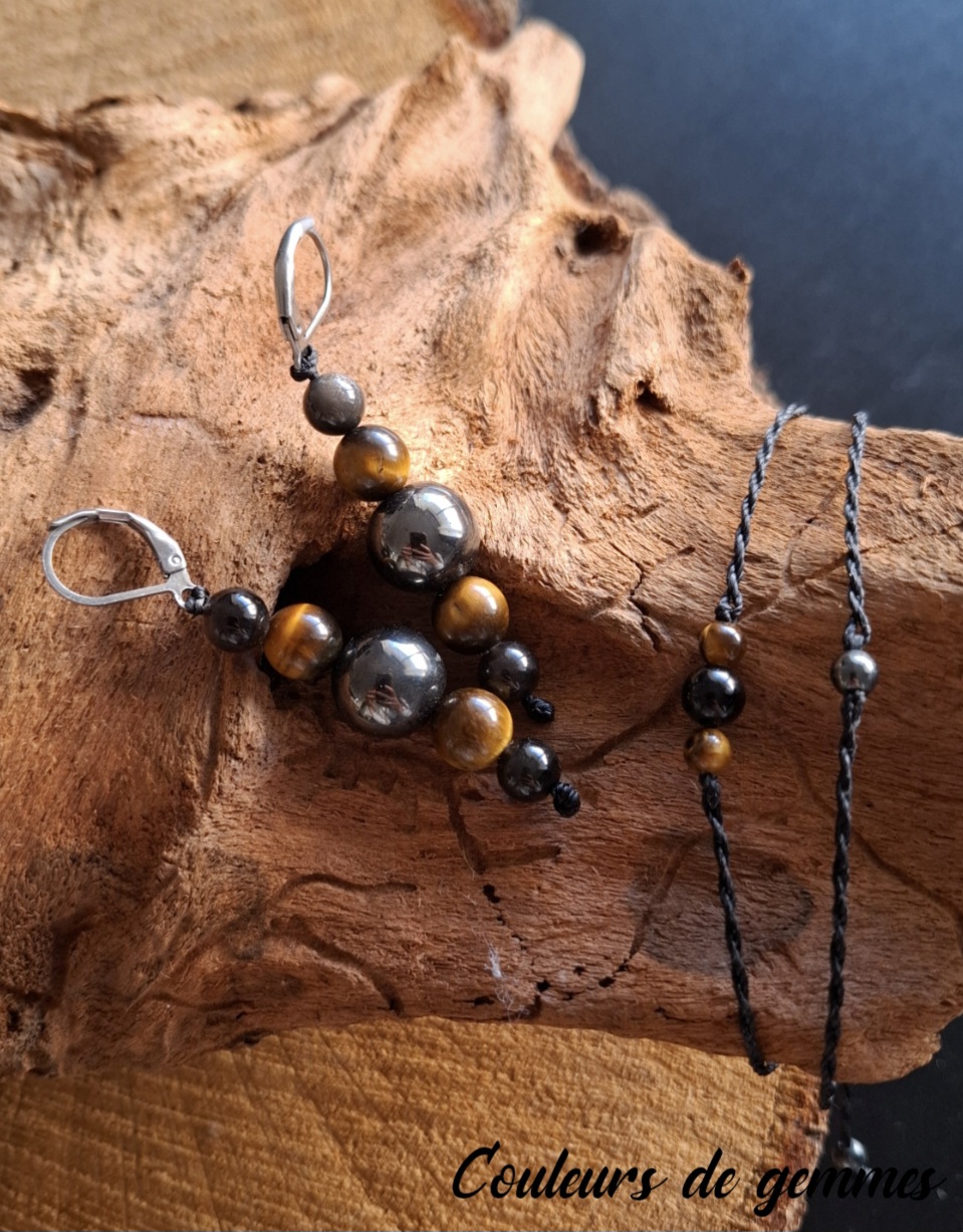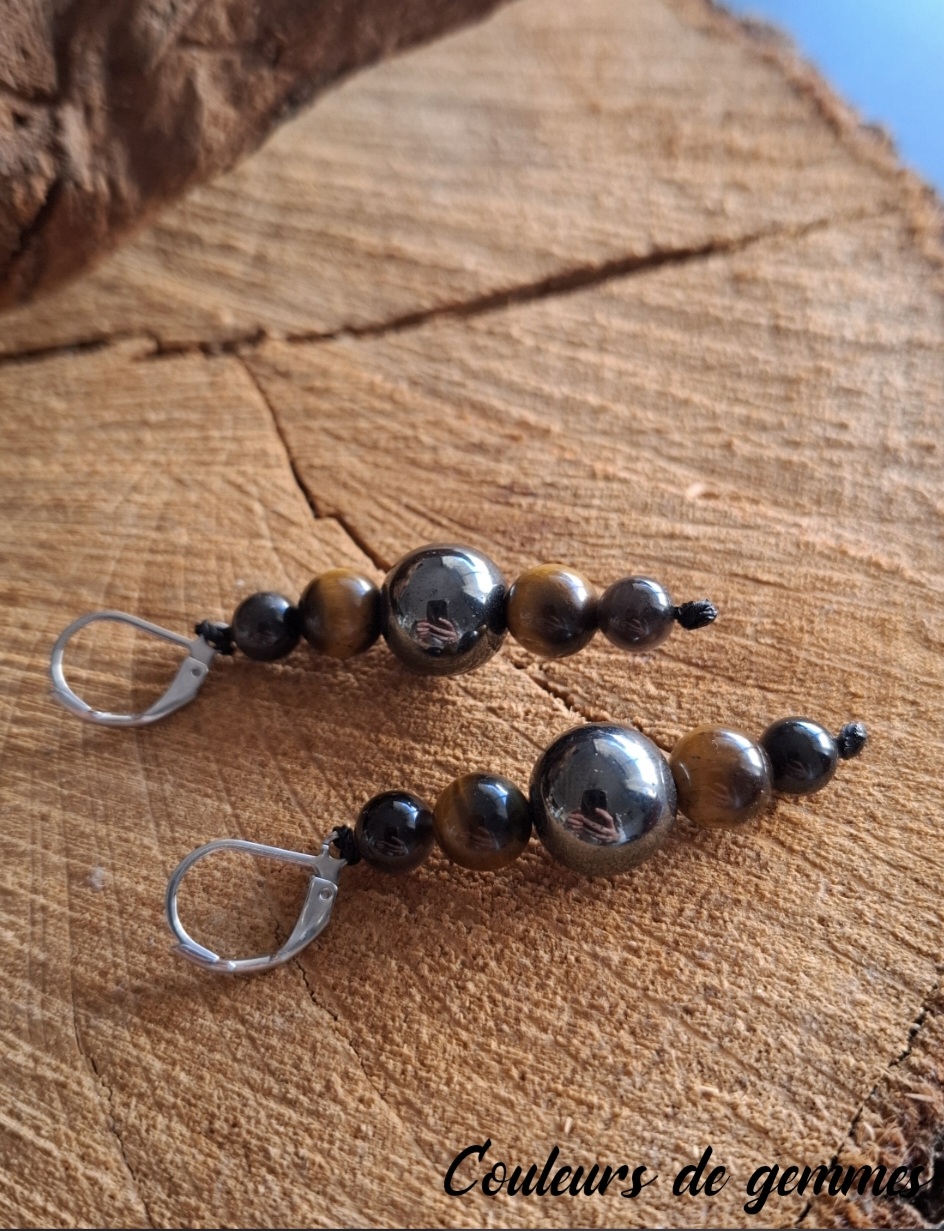 Boucles d'oreilles avec hématite, œil de faucon et obsidienne argentée. Fermoir en acier inoxydable.