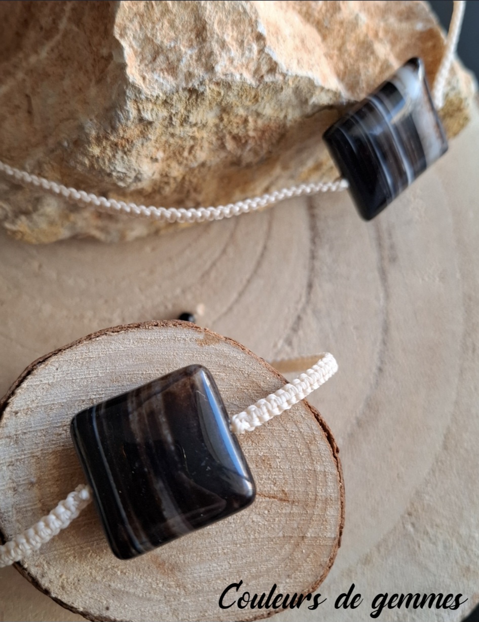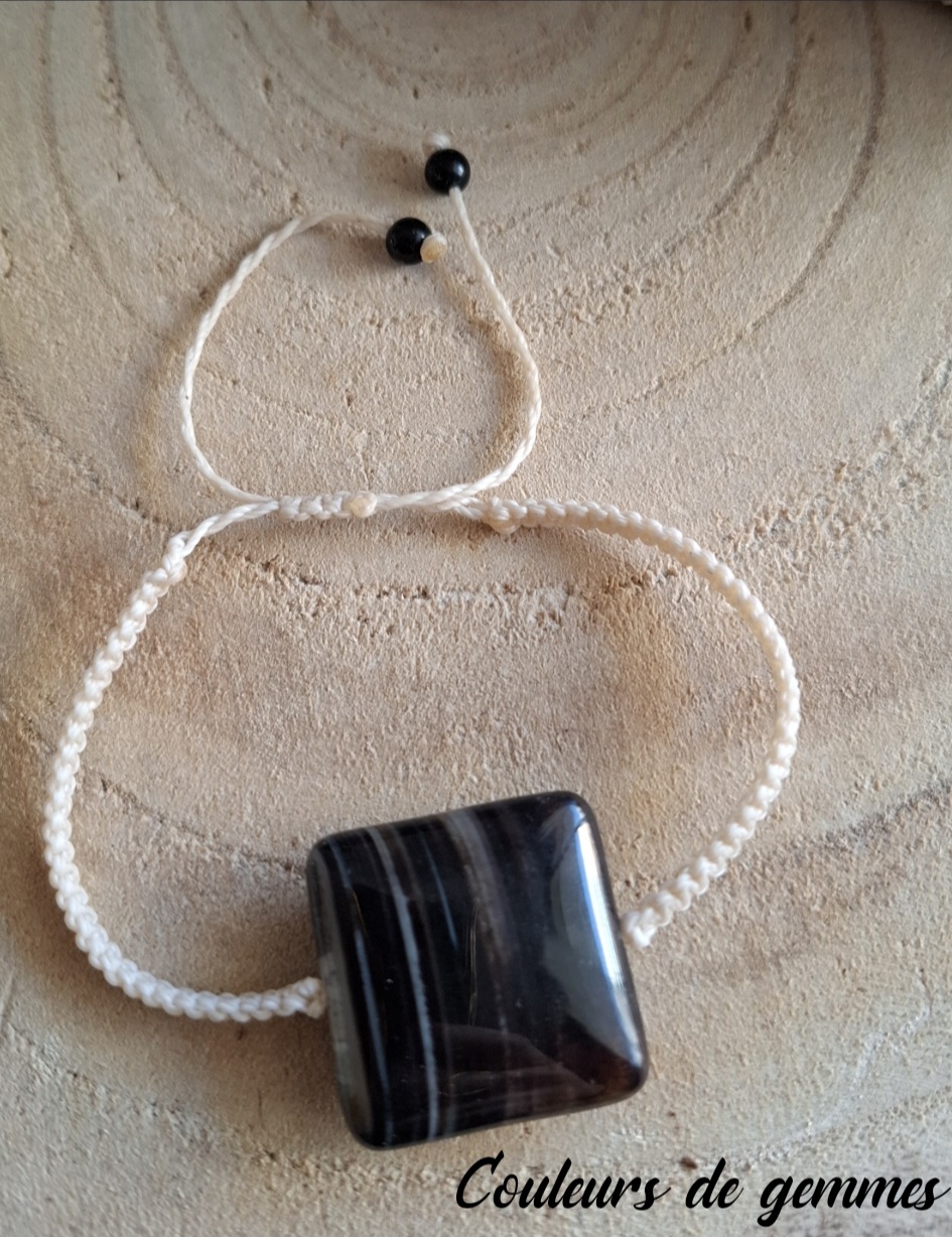 Bracelet avec Agate dentelée et pierres en onyx noir au niveau du fermoir. Réglable avec son fermoir coulissant.
