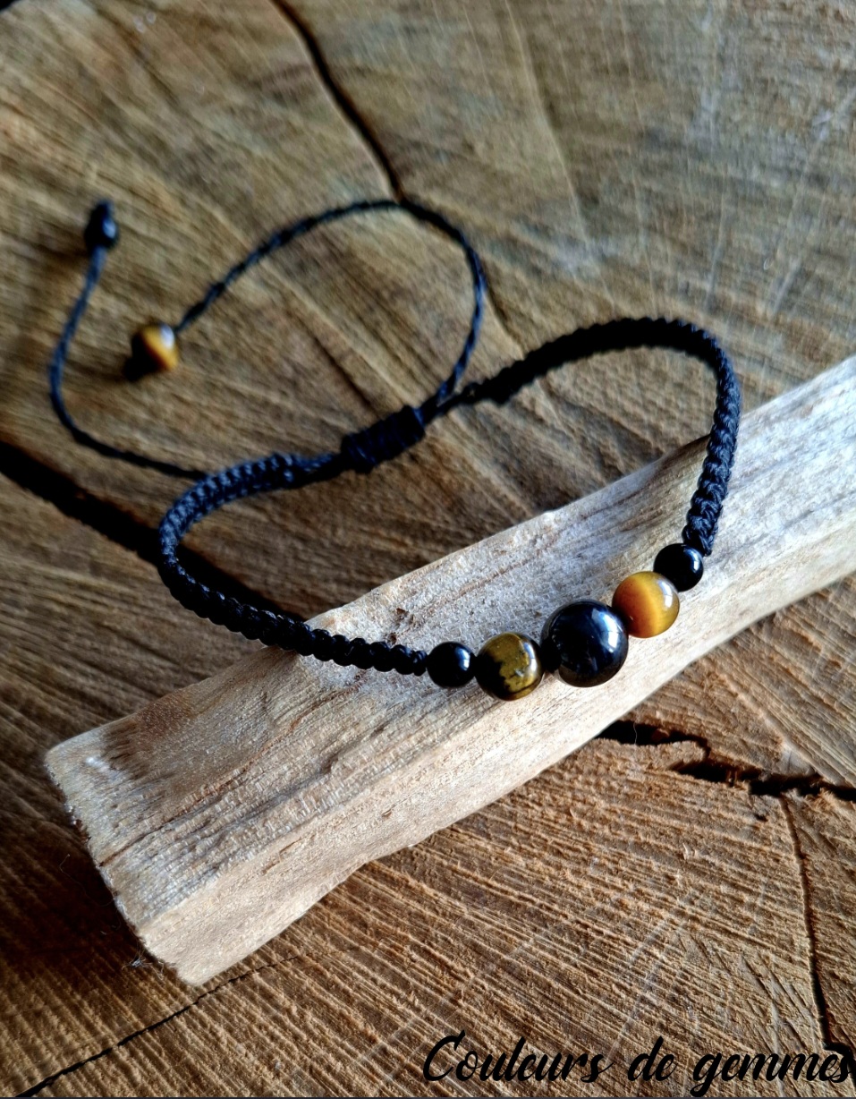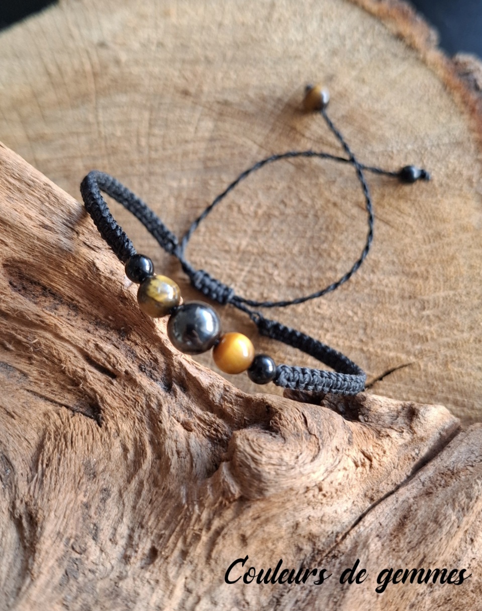 Bracelet avec hématite, œil de tigre et obsidienne argentée. Réglable avec son fermoir coulissant.