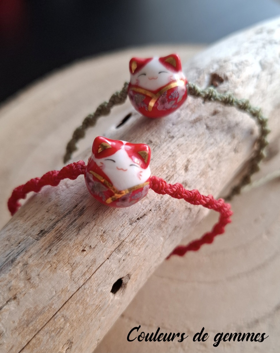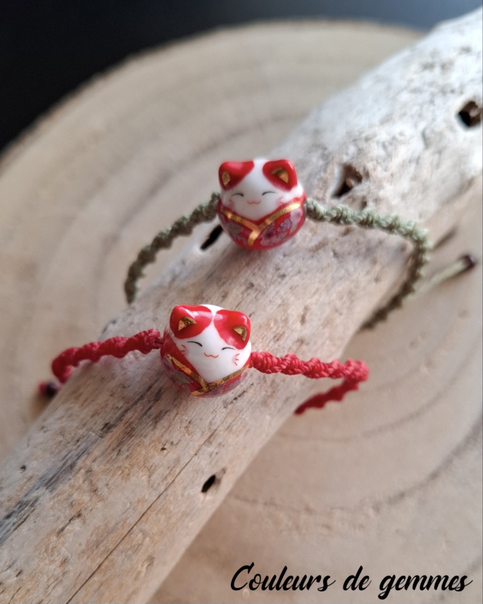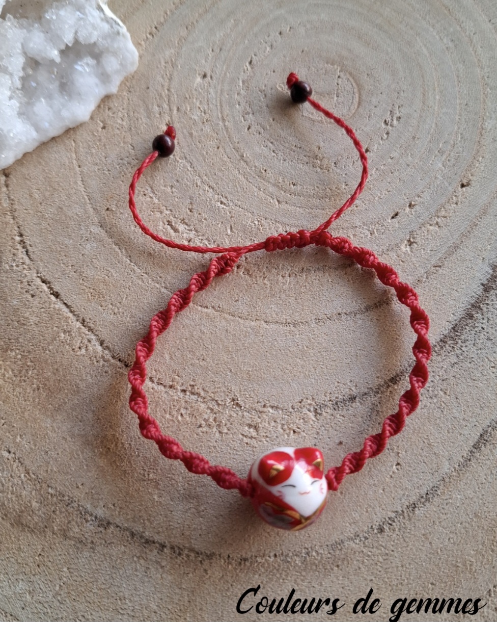Bracelet Chat Porcelaine Porte-bonheur lien rouge. Jaspe mokaïte au niveau du fermoir. Réglable avec son fermoir coulissant.